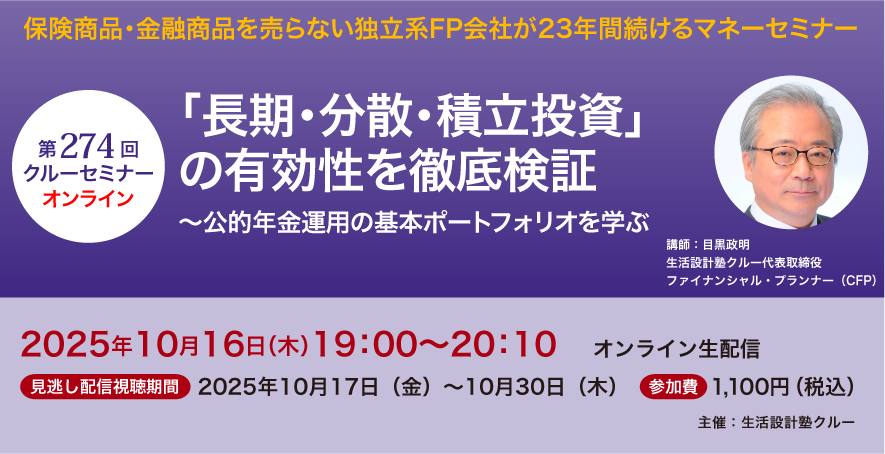 講師は、資産運用アドバイスを専門とする生活設計塾クルー代表取締役の目黒政明が務めます。