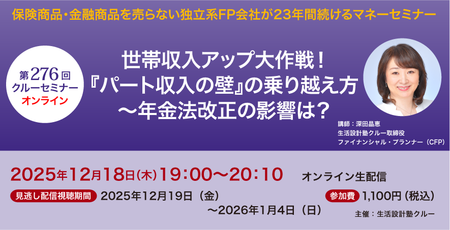 講師は、手取り収入の試算をライフワークとし、幅広い年代へのコンサルティングを行っている生活設計塾クルーの深田晶恵がつとめます。