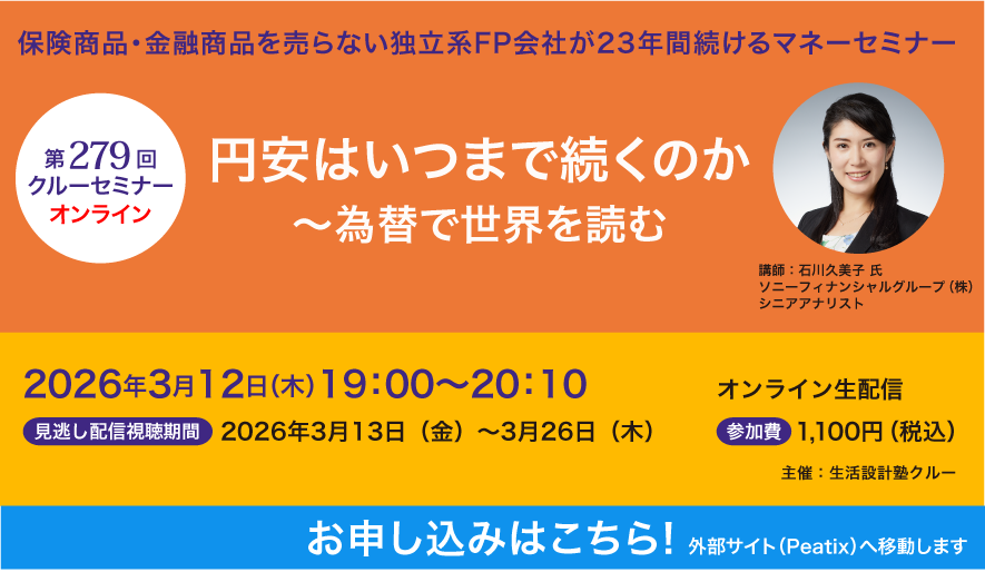 ここ数年の物価上昇に「家計が苦しい!」といった悲鳴が至るところから聞こえてきます。原因の一つが円安だと言われますが、そもそも円安とか円高ってどういうことでしょうか。為替の適正水準ってあるのでしょうか。また、昨年に続き2026年も初頭から、米国のトランプ大統領の一挙手一投足に金融市場が一喜一憂する展開が続いています。3月のクルーセミナーは、ソニーフィナンシャル・グループの金融市場調査部シニアアナリストの石川久美子氏に、外国為替相場の基本構造と、私たちがニュースに接する際の情報やリスクとの向き合い方をお話していただきます。
