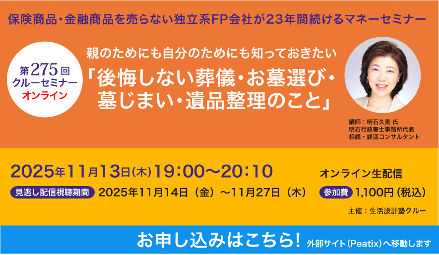 そこで、葬儀、墓の選び方、墓じまい、遺品整理業者の選び方、仏壇・人形などの処分の仕方のほか、グリーフにも触れながら、今どきの現状や注意点についてお伝えします。
