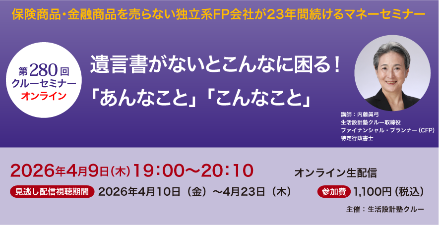 「みんな仲がいいから揉め事なんて起きない」「遺言を残すほどの財産はない」「縁起でもない」など、理由は様々ですが、まだまだ遺言書を書くことへのハードルは高いのが現状です。とはいえ、終活という言葉の広まりとともにエンディングノートを書く人が増えたり、メディアで「相続問題」が頻繁に取り上げられるようになるなど、少しずつ遺言書への関心は高まっているようです。少子高齢化の影響もあり、家族の在り方は多様化しています。相続人がいないとか、いても疎遠になっているケースも多く、相続人以外の人に財産を残したいというニーズも増えています。本セミナーでは、遺言書がないために困ったケース、遺言書があっても困ったケースを紹介し、想いを実現できる遺言書の書き方と注意点をお伝えします。親に遺言書を書いてもらいたいと思っている人や、遺言書を書きたいけれど何から始めていいか分からない人は是非ご参加ください。